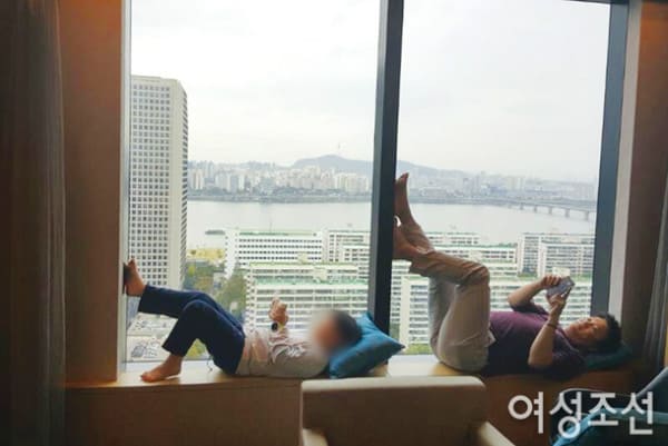 이혼 소송 중, 임우재는 자신의 SNS를 통해 아들과 함께 찍은 사진을 공개했습니다. 여의도 한 호텔의 창틀에 나란히 누워서 각자 핸드폰을 보고 있는 사진인데 한눈에 붕어빵 부자의 모습이 상상됩니다.