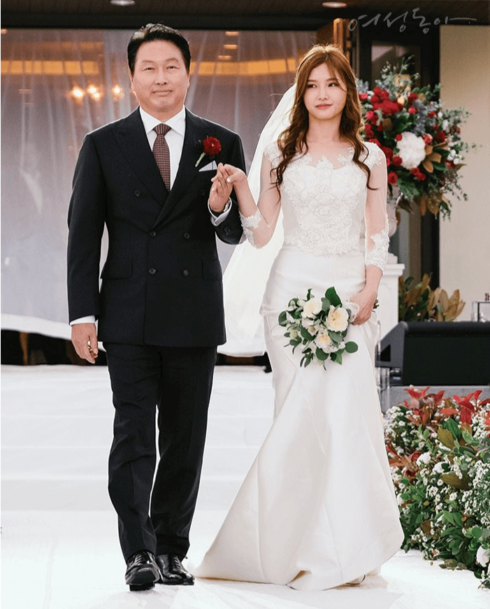 최윤정은 SK에 입사하고 같은 해, 2017년 웨딩마치를 올렸습니다. 2015년 아버지의 혼외자 고백 이후 이혼 소송이 시작되었을 때로 집안 분위기는 결코 좋지 못했지만, 그만큼 놓치고 싶지 않은 인연이었나 봅니다. 결혼식 당시 아버지 손을 잡은 신부 최윤정은 또 한 번 눈부신 미모를 자랑했습니다.
