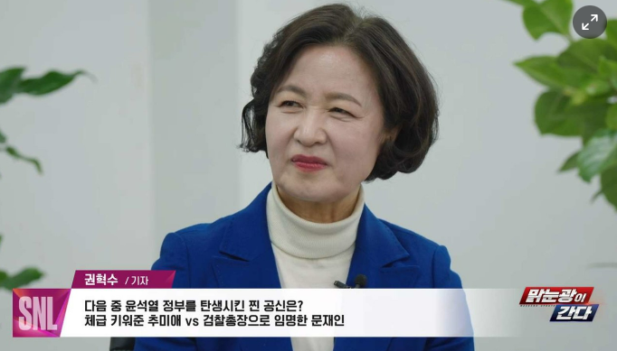 4.10 총선을 앞두고 SNL 코리아에 출연한 추미애가 받은 질문입니다. 추미애는 2번 문재인이라고 답변하며, “제대로 검증하지 않고 서울 중앙지검장으로 임명하고 또 검찰총장으로 발탁했다"면서 ”윤석열이 검찰총장으로서 막강한 권한을 본인의 정치 발판으로 활용한 것"이라고 설명했습니다.