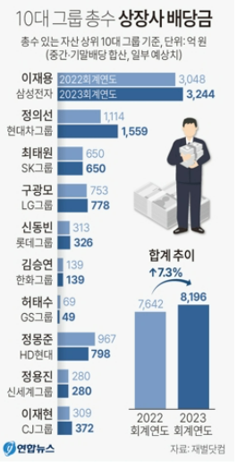 삼성전자 이재용 회장은 2017년부터 무보수 경영을 실천 중입니다. 하지만 2023년 상장자 배당금으로만 3천 억 원을 받았는데, 이는 정의선 회장의 배당금 2배 가까이에 달하는 금액으로 연봉을 뛰어넘는 재산을 불렸습니다. 재벌닷컴에서 발표혀나 10대 그룹 총수 배당금은 이재용, 정의선, 최태원, 구광모, 신동빈 순으로 높았습니다.